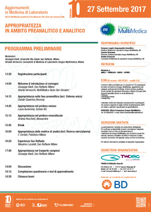 L’evento è stato accreditato per un massimo di 120 partecipanti tra interni ed esterni al Gruppo MultiMedica, appartenenti alle categorie professionali dei Biologi, Chimici (chimica analitica), Tecnici Sanitari di Laboratorio Biomedico, Infermieri e Medici delle seguenti specialità: